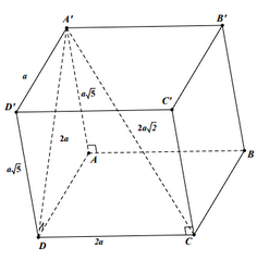 Cho hình hộp ABCD.A’B’C’D’ có đáy là hình chữ nhật với AB = 2a, BC = a. Biết \(\angle A'AB = {90^0}\) và \(AA' = a\sqrt 5 ,\,\,CA' = 2a\sqrt 2 \). Thể tích khối hộp ABCD.A’B’C’D’ bằng