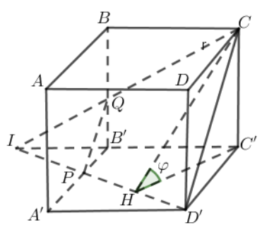 Cho hình lập phương ABCD.A’B’C’D’ có cạnh bằng a. Gọi \(\left( \alpha \right)\) là mặt phẳng đi qua CD’ và tạo với mặt phẳng (A’B’C’D’) một góc \(\varphi \) với \(\tan \varphi = \dfrac{{\sqrt 5 }}{5}\). Mặt phẳng \(\left( \alpha \right)\) chia khối lập phương thành hai khối đa diện có thể tích là V1, V2 với V1 > V2. Tính V1.