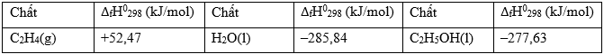 Cho phương trình hoá học của phản ứng: C2H4 (g) + H₂O (l) → C2H5OH (I)Biết nhiệt tạo thành