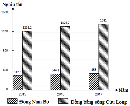 Cho bảng số liệu sau:Sản lượng thủy sản khai thác của Đông Nam Bộ và Đồng bằng sông Cửu