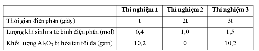Điện phân dung dịch chứa x mol CuSO4, y mol HCl và z mol KCl (với điện cực trơ, có màng ngăn xốp, hiệu suất điện phân là 100%). Lượng khí sinh ra từ quá trình điện phân và khối lượng Al2O3 bị hòa tan tối đa trong dung dịch sau điện phân ứng với mỗi thí nghiệm được cho ở bảng dưới đây:
