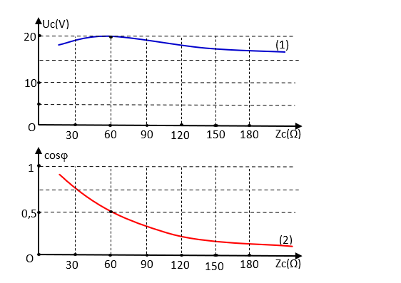 Đặt điện áp \(u = {U_0}\cos \left( {\omega t + \varphi } \right)\,\,\left( V \right)\) vào hai đầu đoạn mạch có R, L, C nối tiếp. Trong đó tụ điện có điện dung C thay đổi được. Hình bên là đồ thị biểu diễn sự phụ thuộc của điện áp hiệu dụng hai đầu tụ điện \({U_C}\) và đồ thị hệ số công suất của mạch \(\cos \varphi \) theo dung kháng \({Z_C}\) của tụ. Khi \({Z_C} = 90\,\,\Omega \) thì điện áp hiệu dụng giữa đầu điện trở là