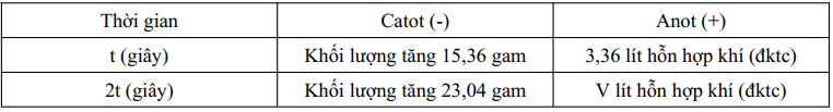 Tiến hành điện phân dung dịch chứa m gam hỗn hợp gồm CuSO4 và KCl bằng điện cực trơ, màng ngăn xốp với cường độ dòng điện không đổi. Kết quả quá trình điện phân được ghi theo bảng sau: