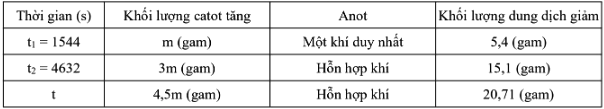 Điện phân dung dịch chứa đồng thời NaCl và CuSO4 (điện cực trơ, mảng ngăn xốp, hiệu suất điện phân 100%, bỏ qua sự hòa tan của các khí trong nước và sự bay hơi nước) với cường độ dòng điện không đổi. Kết quả của thí nghiệm được ghi ở bảng sau: