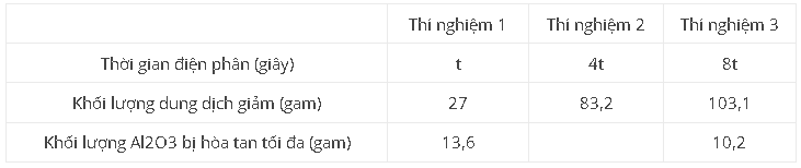 Điện phân dung dịch chứa x mol CuSO4, y mol H2SO4 và z mol NaCl (với điện cực trơ, có màng ngăn xốp, hiệu suất điện phân là 100%). Khối lượng dung dịch giảm và khối lượng Al2O3 bị hòa tan tối đa trong dung dịch sau điện phân ứng với mỗi thí nghiệm được cho ở bảng dưới đây: