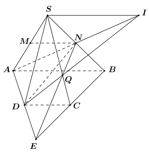 c) Gọi \(I = AN \cap DQ\). Chứng minh SI // SB, SI // CD. Tứ giác SABI là hình gì? Vì sao?