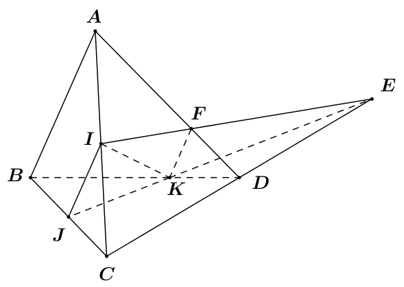Cho tứ diện ABCD. Gọi I, J lần lượt là trung điểm của AC và BC. Trên cạnh BD lấy điểm K sao cho BK = 2KD.