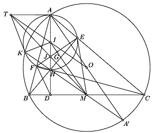 d) Tiếp tuyến tại \(A\) và \(K\) của đường tròn ngoại tiếp tam giác \(AEF\) cắt nhau tại \(T\). Chứng minh rằng \(TM,AH,EF\) dồng quy.