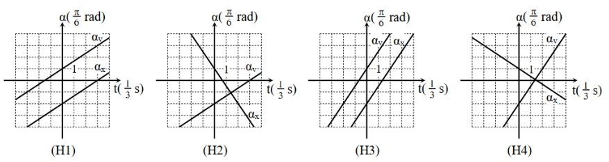 Một con lắc lò xo nằm ngang dao động điều hòa trên trục Ox với biên độ 8cm. Gốc thời gian t = 0 là lúc vật qua vị trí có li độ 4cm với vận tốc \(3\pi \sqrt 3 \,\,cm/s\). Hình nào sau đây mô tả sự biến đổi pha của li độ \(\left( {{\alpha _x}} \right)\) theo thời gian và pha của vận tốc \(\left( {{\alpha _v}} \right)\) theo thời gian?