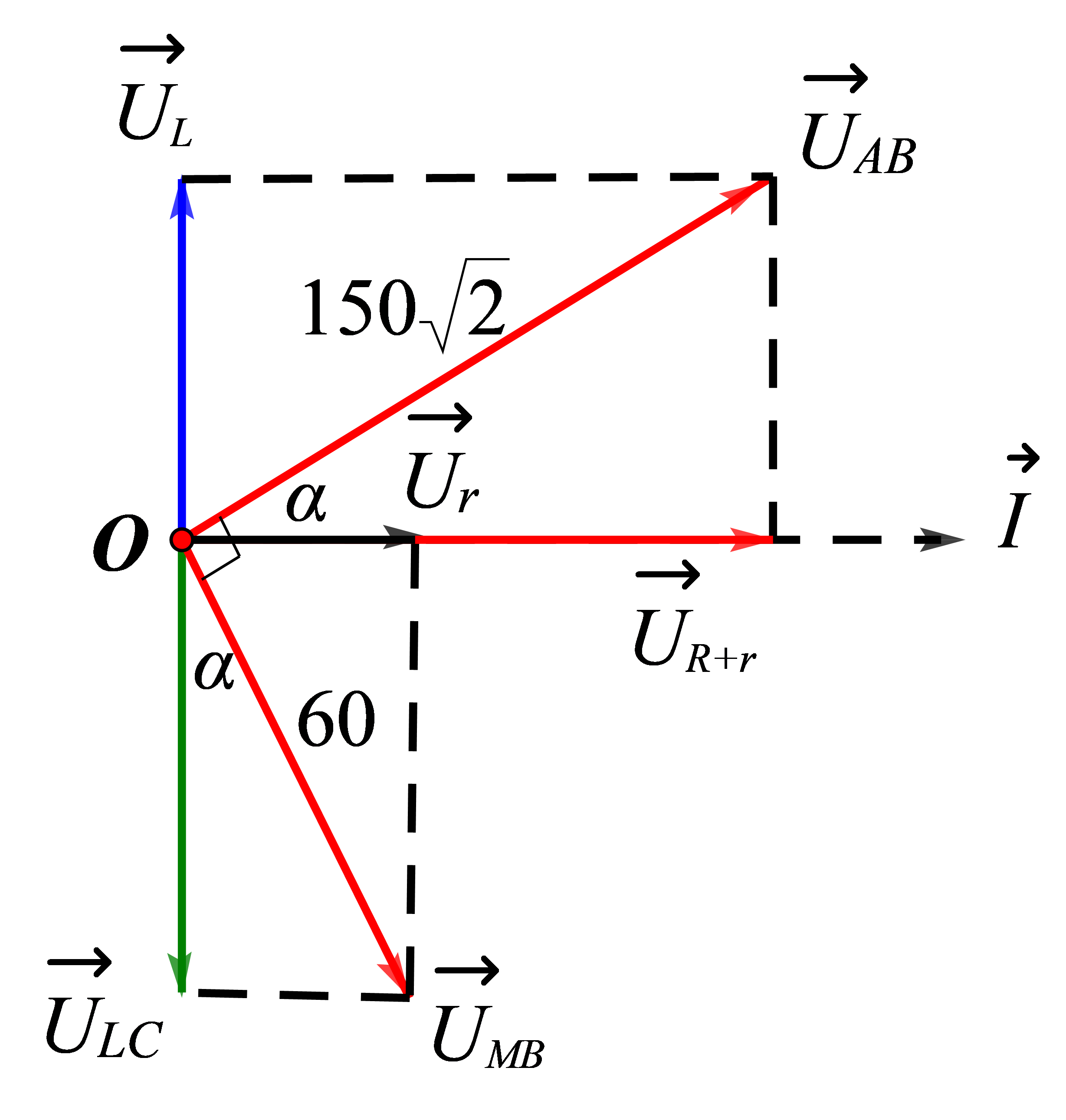 Vẽ giản đồ vecto, sử dụng công thức lượng giác để tính \({U_R},{U_r},{U_{LC}},{U_{AB}}\)