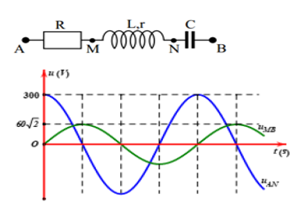 Cho đoạn mạch AB như hình vẽ. Đặt vào hai đầu mạch một điện áp xoay chiều \(u = U\sqrt 2 \cos \left( {100\pi t + \varphi } \right)\,\,\left( V \right)\). Đồ thị biểu diễn sự phụ thuộc của điện áp tức thời giữa hai điểm A, N \(\left( {{u_{AN}}} \right)\) và giữa hai điểm M, B \(\left( {{u_{MB}}} \right)\) theo thời gian được biểu diễn như hình vẽ. Hệ số công suất của đoạn mạch AB có giá trị gần giá trị nào nhất sau đây?