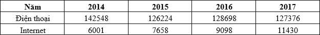 Cho bảng số liệu: SỐ THUÊ BAO ĐIỆN THOẠI VÀ INTERNET NƯỚC TA GIAI ĐOẠN 2014 – 2017 (Đơn vị: