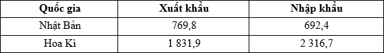 Cho bảng số liệu sau:GIÁ TRỊ XUẤT NHẬP KHẨU CỦA HOA KÌ VÀ NHẬT BẢN NĂM 2010(Đơn vị: triệu
