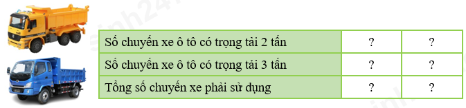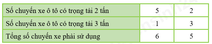 Số xe 3 tấn phải nhỏ hơn 5. Ta lần lượt tính khối lượng 1, 2, 3, 4 xe 3 tấn rồi tính số xe 2 tấn cần phải sử dụng để chở được đúng 13 tấn khoai. So sánh tổng số chuyến để lựa chọn cách vận chuyển có tổng số chuyến xe phải sử dụng là ít nhất.