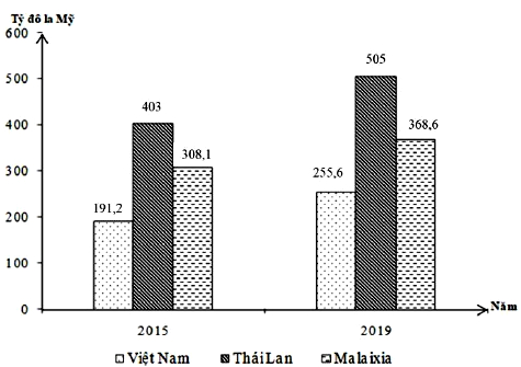 Cho biểu đồ: GDP CỦA VIỆT NAM, THÁI LAN VÀ MALAIXIA NĂM 2015 VÀ 2019 (Số liệu theo Niên giảm