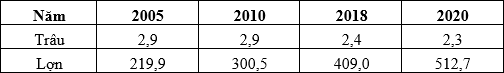 Cho bảng số liệu: SỐ LƯỢNG TRÂU VÀ LỢN CỦA NƯỚC TA GIAI ĐOẠN 2005 – 2020 (Đơn vị: Triệu