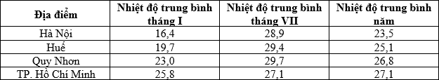Cho bảng số liệu: NHIỆT ĐỘ TRUNG BÌNH TẠI MỘT SỐ ĐỊA ĐIỂM CỦA NƯỚC TA (Đơn vị: