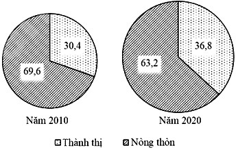 Cho biểu đồ về dân số phân theo thành thị và nông thôn nước ta, năm 2010 và năm 2020 (Đơn