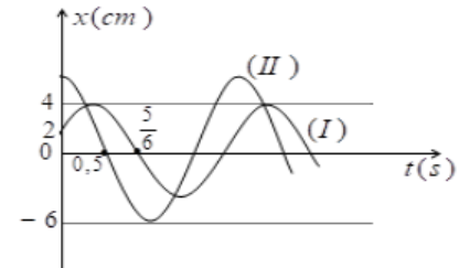 Hai dao động điều hòa cùng phương trình \({x_1} = {A_1}\cos \left( {\omega t + {\varphi _1}} \right)\)và \({x_2} = {A_2}\cos \left( {\omega t + {\varphi _2}} \right)\), trên hình vẽ đường đồ thị (I) biểu diễn dao động thứ nhất, đường đồ thị (II) biểu diễn tổng hợp của hai dao động.