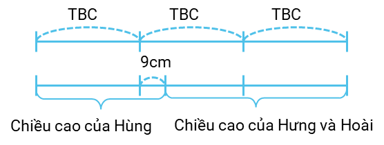 Chiều cao của Hùng nhiều hơn chiều cao trung bình của 3 anh em là 9cm nên tổng chiều cao của Hưng và Hoài ít hơn 2 lần chiều cao trung bình của 3 anh em là 9cm. Ta tính được chiều cao trung bình của 3 anh em, sau đó tính được chiều cao của Hùng.