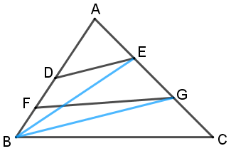 Cho tam giác ABC có \({\rm{BE}} = {\rm{ED}} = \dfrac{1}{2}{\rm{AD,}}\) \({\rm{AF}} = {\rm{FG}} = {\rm{GC}}\) (hình