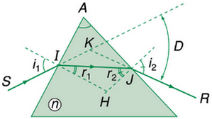 Chiếu một chùm tia sáng hẹp, đơn sắc vào mặt bên của một lăng kính. Sau khi khúc xạ tại hai mặt bên của lăng kính, tia sáng ló ra khỏi lăng kính