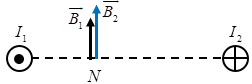 Cho hai dòng điện thắng dài \({I_1}\) và \({I_2}\) đặt song song cách nhau 15cm, mang dòng điện chạy ngược chiều. Gọi N là điểm cách hai dòng điện \({I_1},{I_2}\) lần lượt là 5cm và 10cm. Biết \({I_1} = 15A,{I_2} = 30A\). Gọi \(\overrightarrow {{B_1}} ,\overrightarrow {{B_2}} \) lần lượt là vectơ cảm ứng từ do dòng điện \({I_1},{I_2}\) gây ra tại N. Hệ thức nào sau đây đúng?