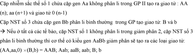 Một loài thực vật, cặp nhiễm sắc thể số 1 chứa cặp gen Aa; cặp nhiễm sắc thể số 3 chứa cặp gen Bb. Nếu ở tất cả các tế bào, cặp NST số 1 không phân li trong giảm phân 2, cặp NST số 3 phân li bình thường thì cơ thể có kiểu gen AaBb giảm phân sẽ tạo ra các loại giao tử có kiểu gen