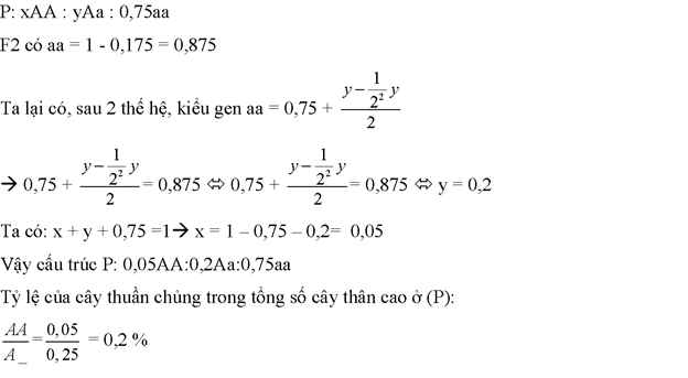 Một quần thể thực vật lưỡng bội, alen A quy định thân cao trội hoàn toàn so với alen a quy định thân thấp. Ở thế hệ xuất phát (P) gồm 25% cây thân cao và 75% cây thân thấp. Khi (P) tự thụ phấn liên tiếp qua hai thế hệ, ở F2, cây thân cao chiếm tỉ lệ 17,5%. Theo lí thuyết, trong tổng số cây thân cao ở (P), cây thuần chủng chiếm tỉ lệ