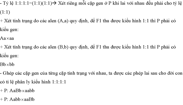 - Phân tích kiểu hình ở F1 thành tích kiểu hình của các tính trạng riêng rẽ để suy ra kiểu gen P