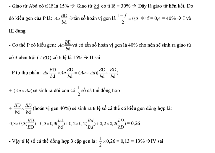 Một cơ thể (P), xét 3 cặp gen dị hợp Aa, Bb, Dd. Trong đó, cặp Bb và cặp Dd cùng nằm trên một cặp nhiễm sắc thể. Giả sử quá trình giảm phân bình thường, cơ thể P đã tạo ra loại giao tử Abd chiếm 15%. Cho biết không xảy ra đột biến. Theo lí thuyết, có bao nhiêu phát biểu sau đây đúng?