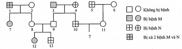 Sơ đồ phả hệ dưới đây mô tả sự di truyền của 2 bệnh M và N ở người; mỗi bệnh do một