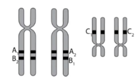 Hình vẽ sau mô tả 2 cặp NST thường đã nhân đôi trong giảm phân. Các alen của 3 gen A, B và C được kí hiệu bên dưới:
