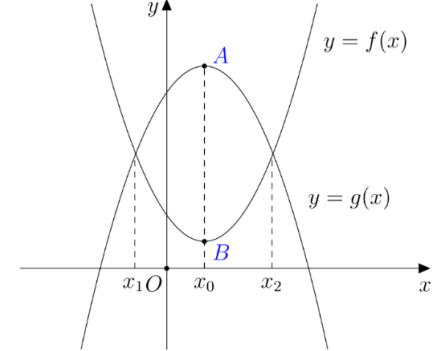 Cho hai hàm số \(y = f\left( x \right),y = g\left( x \right)\) có đồ thị là hai đường cong trong hình vẽ. Biết rằng đồ thị hàm số \(y = f\left( x \right)\) có đúng một điểm cực trị là A, đồ thị hàm số \(y = g\left( x \right)\) có đúng một điểm cực trị là B và \({x_A} = {x_B},\) AB = 5.