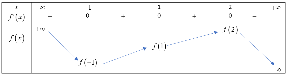 Cho hàm số \(y = f\left( x \right)\) liên tục trên \(\mathbb{R}\) và có đạo hàm \(f'\left( x \right) = \left( {x + 1} \right){\left( {x - 1} \right)^4}\left( {2 - x} \right)\). Mệnh đề nào dưới đây đúng?