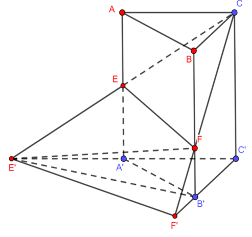 Cho hình lăng trụ tam giác đều ABC.A’B’C’ có tất cả các cạnh bằng a. Gọi E là trung điểm cạnh AA’ và F thuộc cạnh BB’ thỏa mãn BF = 2FB’; đường thẳng CE cắt đường thẳng C’A’ tại E’, đường thẳng CF cắt đường thẳng C’B’ tại F’. Thể tích khối đa diện EFA’B’E’F’ bằng