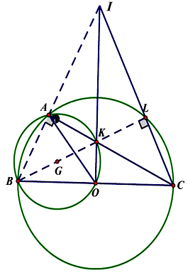 Cho đường tròn \(\left( {\rm{O}} \right)\) có đường kính \({\rm{BC}},\) \({\rm{A}}\) là điểm nằm trên \(\left( {\rm{O}} \right)\) \(({\rm{AB}} < {\rm{AC}},\) \({\rm{A}}\) khác \({\rm{B}})\). Đường tròn ngoại tiếp tam giác \({\rm{ABO}}\) cắt đoạn thẳng \({\rm{AC}}\) tại điểm thứ hai là \({\rm{K}}\). Đường thẳng \({\rm{BK}}\) cắt \({\rm{O}})\) tại điểm thứ hai là \({\rm{L}}\). Các đường thẳng \({\rm{CL}},{\rm{OK}}\) cắt nhau tại \({\rm{I}}\). Chứng minh ba điểm \({\rm{A}},{\rm{B}},{\rm{I}}\) thẳng hàng