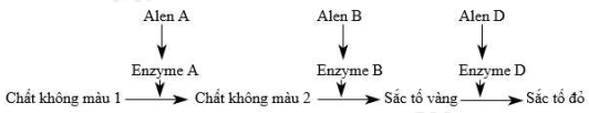 A-B-D-: đỏ; A-B-dd: vàng; còn lại: trắng.