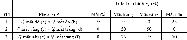 Ở một loài động vật, con cái có cặp nhiễm sắc thể giới tính XX, con đực có cặp nhiễm sắc thể giới tính XY. Tính trạng màu mắt được quy định bởi một gen có 4 alen nằm ở vùng không tương đồng trên X, các alen trội là trội hoàn toàn. Thực hiện 3 phép lai thu được kết quả ở bảng sau: