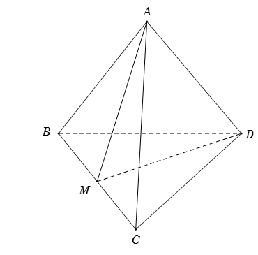 Cho tứ diện \(ABCD\). Đặt \(\overrightarrow {AB} = \overrightarrow a \,,\,\,\overrightarrow {AC} = \overrightarrow b \,,\,\,\overrightarrow {AD} = \overrightarrow c \). Gọi \(M\) là trung điểm của \(BC\). Đẳng thức nào sau đây là đúng khi phân tích \(\overrightarrow {DM} \)?