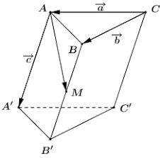 Cho hình lăng trụ \(ABC.A'B'C'\). Gọi \(M\) là trung điểm của \(BB'\). Đặt \(\overrightarrow {CA} = \overrightarrow a \,,\,\,\overrightarrow {CB} = \overrightarrow b \,,\,\,\overrightarrow {AA'} = \overrightarrow c \). Khẳng định nào dưới đây là đúng?