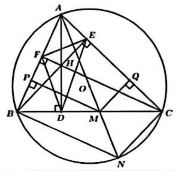 Cho tam giác nhọn \(ABC\,\,(AB < AC)\) nội tiếp đường tròn tâm \(O\), có ba đường cao \(AD,BE,CF{\rm{\;}}\left( {D \in BC,E \in AC,F \in AB} \right)\) cắt nhau tại \(H\). Tia \(AO\) cắt \(BC\) tại \(M\) và cắt \(\left( O \right)\) tại \(N\); gọi \(P,Q\) lần lượt là hình chiếu của \(M\) trên \(AB,AC\). Chứng minh:
