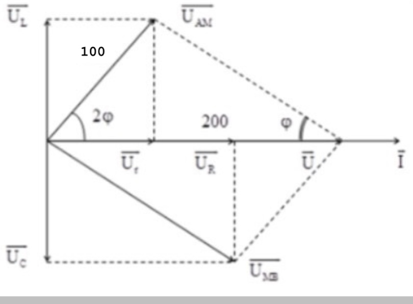 Mạch điện xoay chiều AB gồm một cuộn dây không cảm thuần, một điện trở thuần và một tụ điện mắc nối tiếp theo thứ tự đã nêu. M là điểm giữa cuộn dây và điện trở thuần. Đặt vào hai đầu đoạn mạch AB một điện áp xoay chiều có tần số không đổi và giá trị hiệu dụng 200V thì trong mạch có cộng hưởng điện. Lúc đó điện áp hiệu dụng giữa hai đầu đoạn mạch AM là 100V và độ lệch pha giữa điện áp hai đầu AM so với cường độ dòng điện trong mạch gấp đôi độ lệch pha giữa cường độ dòng điện so với điện áp hai đầu MB. Điện áp hiệu dụng hai đầu MB khi đó có giá trị là