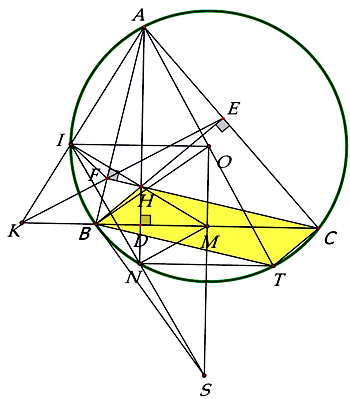 Cho đường tròn \(\left( O \right)\) và dây \(BC\) cố định không đi qua \(O\). Điểm \(A\) thay đổi trên cung lớn \(BC\) sao cho tam giác \(ABC\) là tam giác nhọn \((AB < AC)\). Gọi là các đường cao và \(H\) là trực tâm của tam giác \(ABC\). Gọi \(K\) là giao điểm của hai đường thẳng \(BC\) và \(EF\); \(I\) là giao điểm thứ hai của \(KA\) với \(\left( O \right);M\) là trung điểm \(BC;N\) là giao điểm thứ hai của \(AH\) và \(\left( O \right)\). Chứng minh: