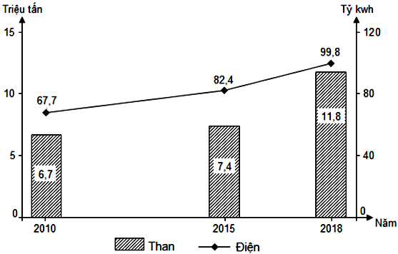 Theo biểu đồ, nhận xét nào sau đây đúng về sản lượng than và điện của Phi-li-pin giai đoạn 2010 - 2018?