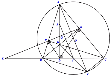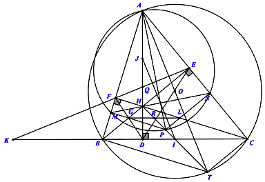 Cho tam giác \(ABC\) nhọn \((AB < AC)\) nội tiếp đường tròn tâm \(O\) và có ba đường cao \(AD,BE,CF\) cắt nhau tại \(H\). Gọi \(I,J\) lần lượt là trung điểm của \(AH\) và \(BC\).