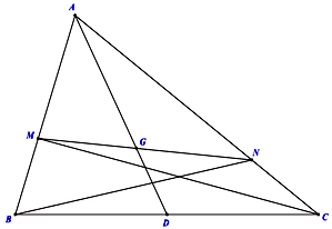 Cho tam giác \(ABC\) cố định có diện tích \(S\). Đường thẳng \(d\) thay đổi đi qua trọng tâm của tam giác \(ABC\) cắt các cạnh \(AB,AC\) lần lượt tại \(M,N\), Gọi \({S_1},{S_2}\) lần lượt là diện tích các tam giác \(ABN\) và \(ACM\). Tìm giá trị nhỏ nhất của \({S_1} + {S_2}\).