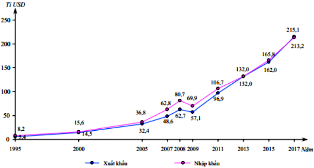 Cho biểu đồ về xuất nhập khẩu của nước ta giai đoạn 1995 - 2017