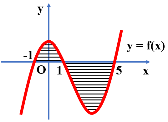 Cho hàm số f(x) liên tục trên \(\mathbb{R}\). Gọi S là diện tích hình phẳng giới hạn bởi các đường y = f(x), y = 0, x = -1 và x = 5 (như hình vẽ bên). Mệnh đề nào dưới đây là đúng?
