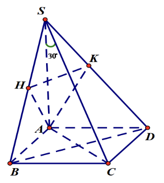 Cho hình chóp S.ABCD biết \(SA \bot \left( {ABCD} \right)\) và đáy ABCD là hình chữ nhật có AB = 3a, AD = 4a. Gọi H, K lần lượt là hình chiếu vuông góc của A lên SB, SD. Mặt phẳng (AHK) hợp với mặt đáy một góc \({30^ \circ }\). Thể tích khối chóp đã cho bằng